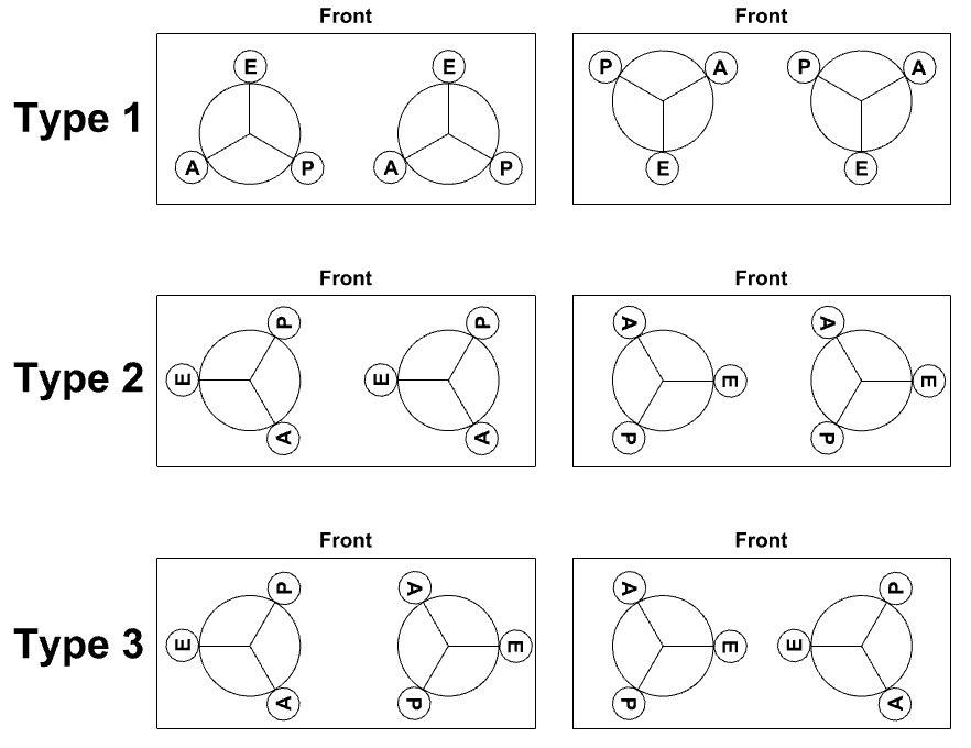 point 120 deg. with six possible layouts |