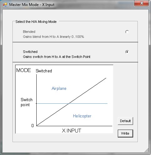 Elevator, Rudder, Pitch, X ( for switching or blending) |